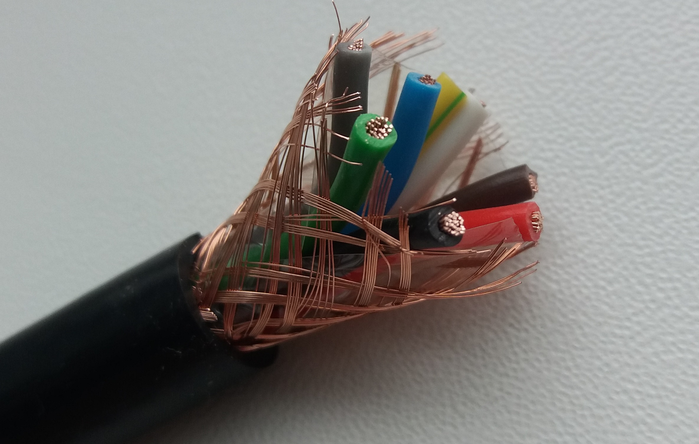 екранований 7х1 мідний холодостійкий негорючий багатодротяна гнучка жила перетином 1 кв. мм - 17 AWG в екрані мідного плетіння (сім жил, шість кольорових, одна жовто-зелена, загальний зовнішній діаметр кабелю 10.2 мм)
