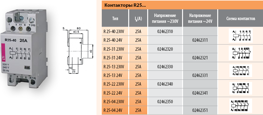 Перейти к заказу модульного контактора на ток 25А и 1 закрытый контакт 3 открытых контакта напряжение 220В